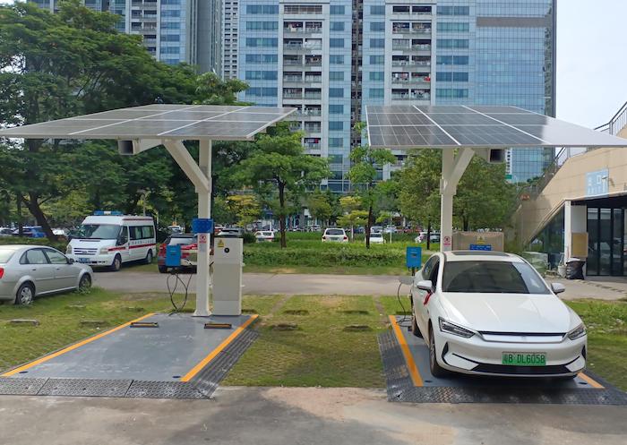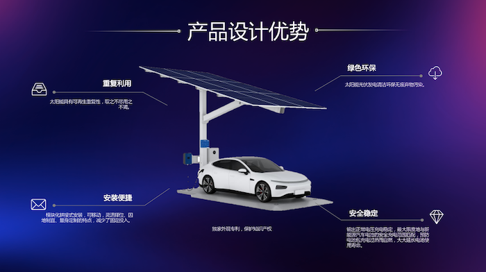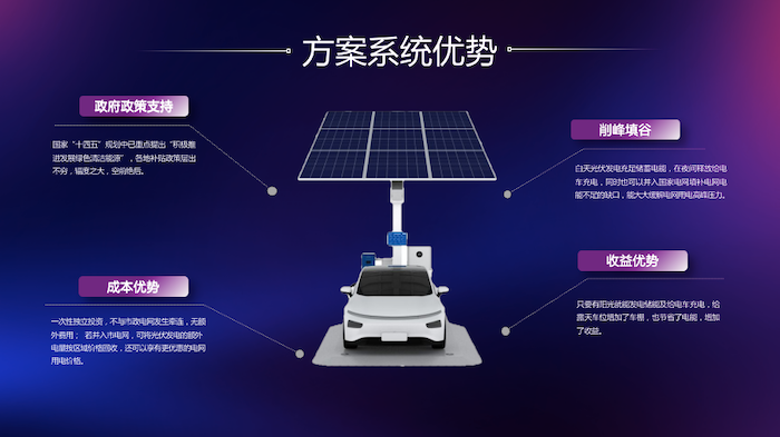 在新能源充电停车位上方安装太阳能光伏电池板,既充分利用了原有的场地,为车辆遮风挡雨,又能利用太阳能给电动汽车充电、照明,大大增加了择位的灵活性和安装的便利性,建设成本更低,落地更快,有效避免沉没成本的投入。方案具有极大的灵活性,可以因地制宜,调整应用最适合的方案。